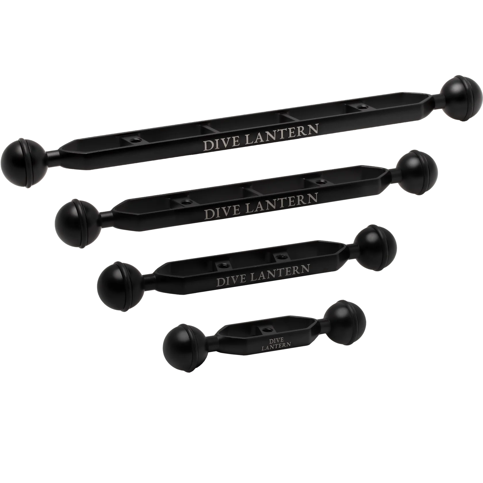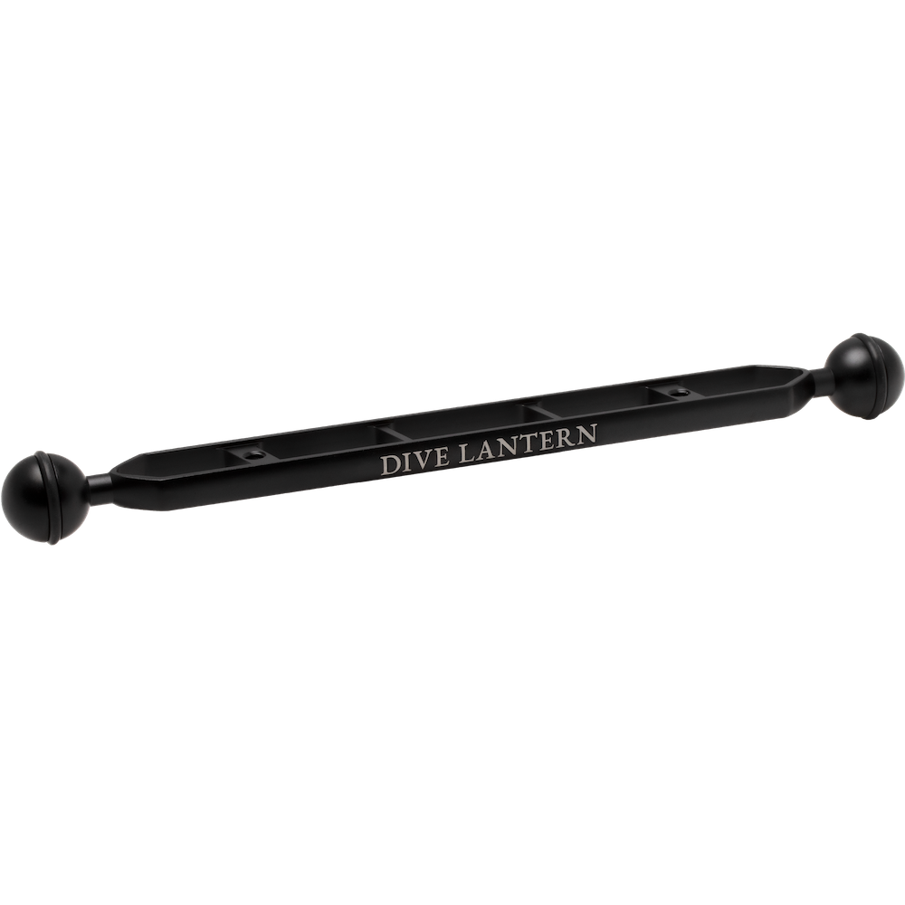 Aluminium double ball arms with one inch ball joint. Each ball arm has at least one threaded hole for adding the Dive Lantern 1" Ball Mount can screw into giving another ball mount on the arm. This can be used for additional lights such as focus lights and snoot lights that are light and don't need to be at the end of the main arms.