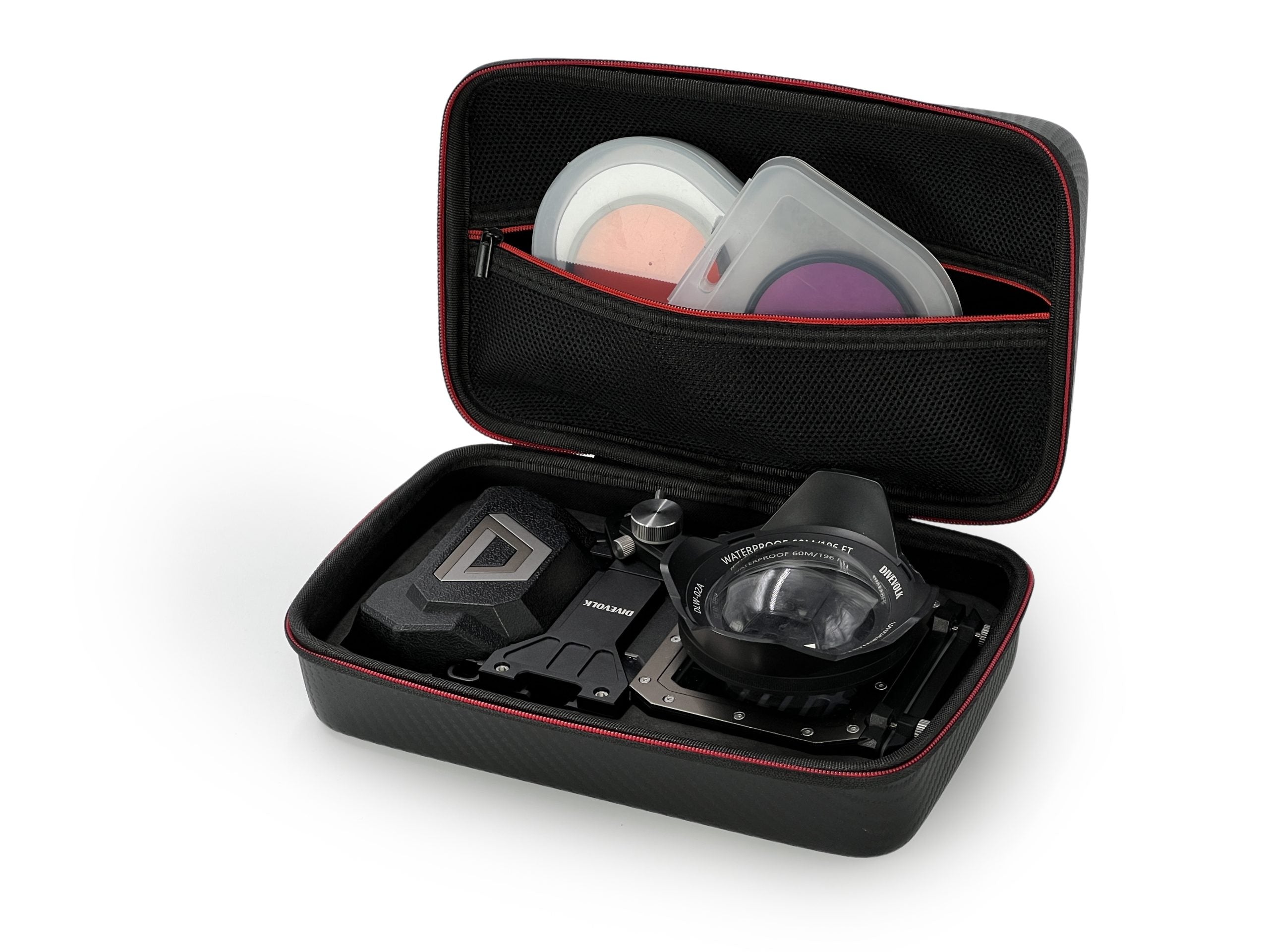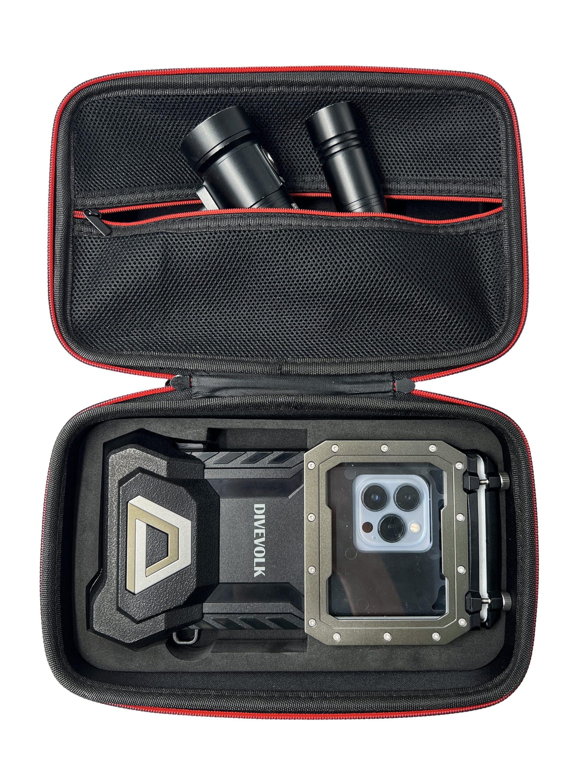 The Eva Box is water resistant on the outside and the correct dimensions to fit the housing with the expansion clamp on inside. There is a mesh pocket at the top for storing accessories.